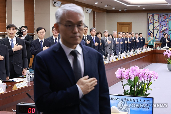 | ▲ 전국법원장회의 임시회의 개최 각급 법원장들이 12일 서울 서초구 대법원에서 열린 전국법원장회의 임시회의에서 국기에 경례하고 있다. |