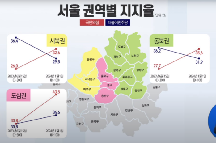 국민의힘, 도심권(용산·종로·중구)·동남권(강남·서초·송파·강동구)서 우세