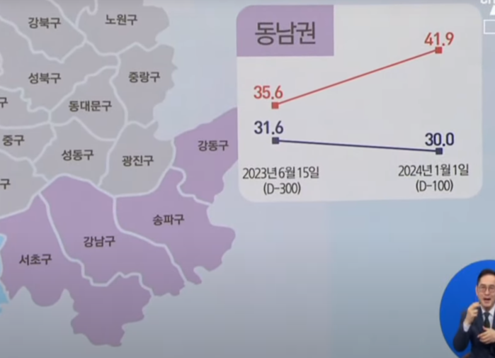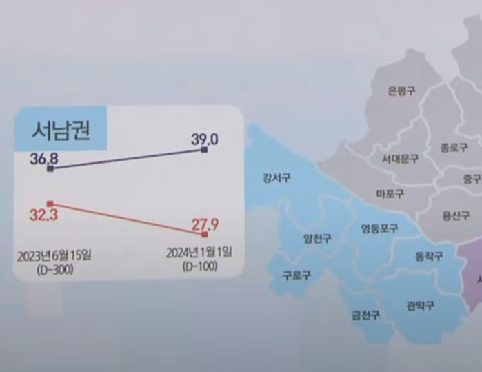 국민의힘은 ‘강남 3구’로 대표되는 동남권에서 41.9%, 민주당은 30% 지지율을 기록했다. 6개월 전에 비해 양당 간 격차가 4.0%포인트에서 11.9%포인트로 벌어졌다.