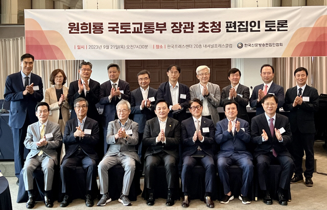 ▲ 21일 서울 중구 한국프레스센터에서 열린 한국신문방송편집인협회 초청 토론회에서 원희룡 국토교통부 장관과 참석자들이 기념 촬영을 하고 있다. |