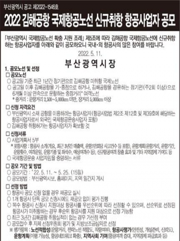 부산시는 오늘부터 25일까지 ‘2022 김해공항 국제항공노선 신규취항 항공사업자 공모’를 진행한다고 밝혔다.