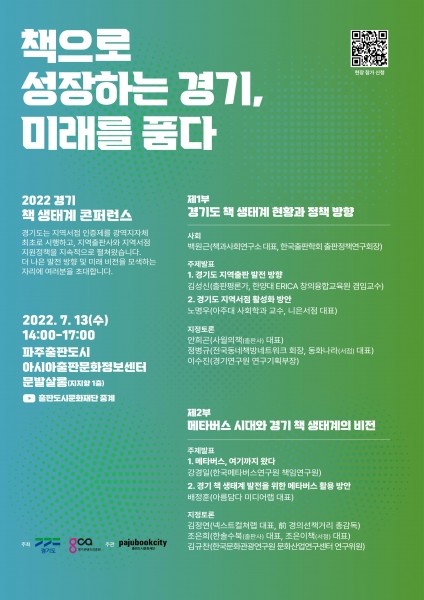 경기도와 경기콘텐츠진흥원이 지역출판·서점 활성화 방안을 모색하기 위해 7월 13일 파주출판도시 아시아출판문화정보센터 내 문발살롱에서 ‘경기 책 생태계 콘퍼런스’를 개최한다.