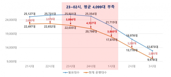 이를 위해 시는 심야시간대 공급 확대를 위해 기존 ‘심야전용택시’ 운영 시작시간을 오후 9시에서 오후 5시로 앞당겨 4시간 연장하는 제도개선을 즉시 추진한다.
