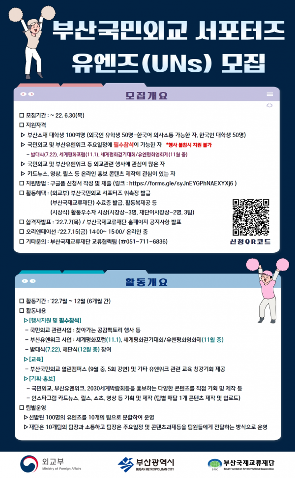 부산시는 외교부, 부산국제교류재단과 함께 국민외교 활성화와 2030부산세계박람회 유치 홍보 등을 위한 부산 국민외교 서포터즈 ‘유엔즈’를 이달 30일까지 모집한다고 밝혔다.