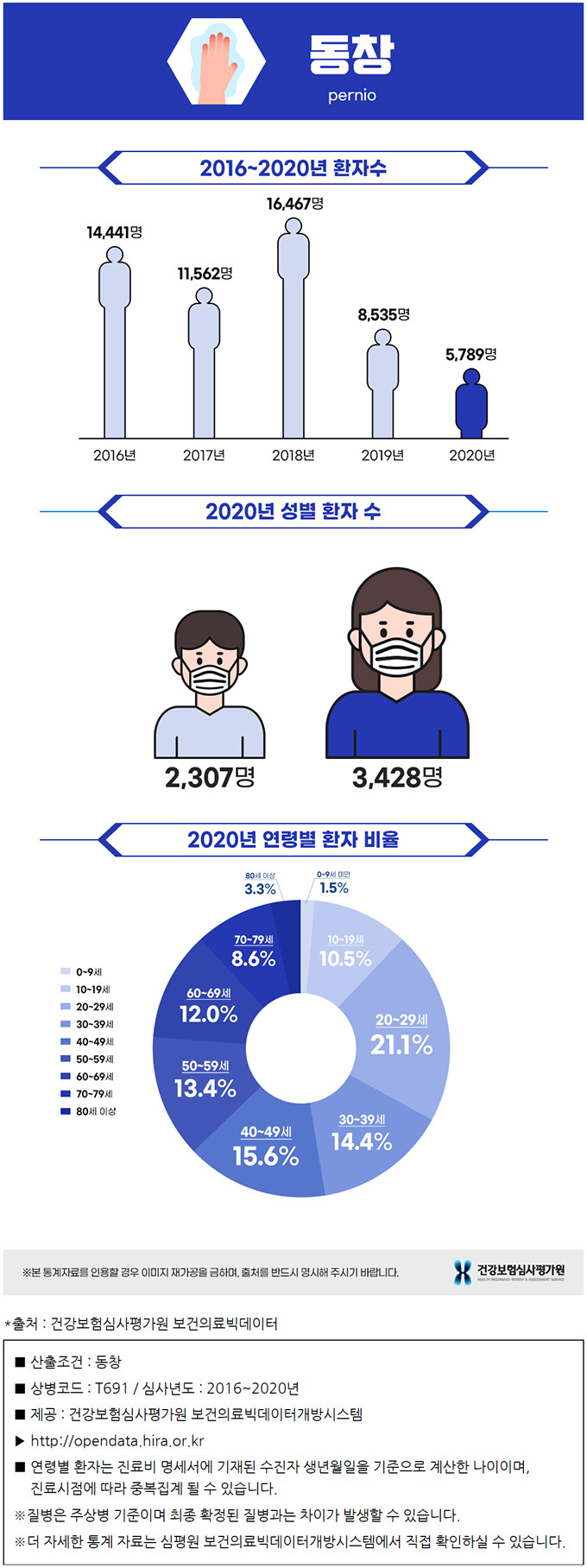 건강보험심사평가원의 통계에 따르면 매년 1만 명이 넘는 동창 환자가 발생하고 있었는데요. 코로나19로 외출이 줄어든 2019년에는 8000명대를 기록하여 전년 대비 절반 수준으로 급격히 하락했습니다. 또한 2020년에도 코로나의 영향으로 환자수가 줄어들었습니다. 성별 환자수를 비교해보면 남성보다 여성 환자가 많았습니다.