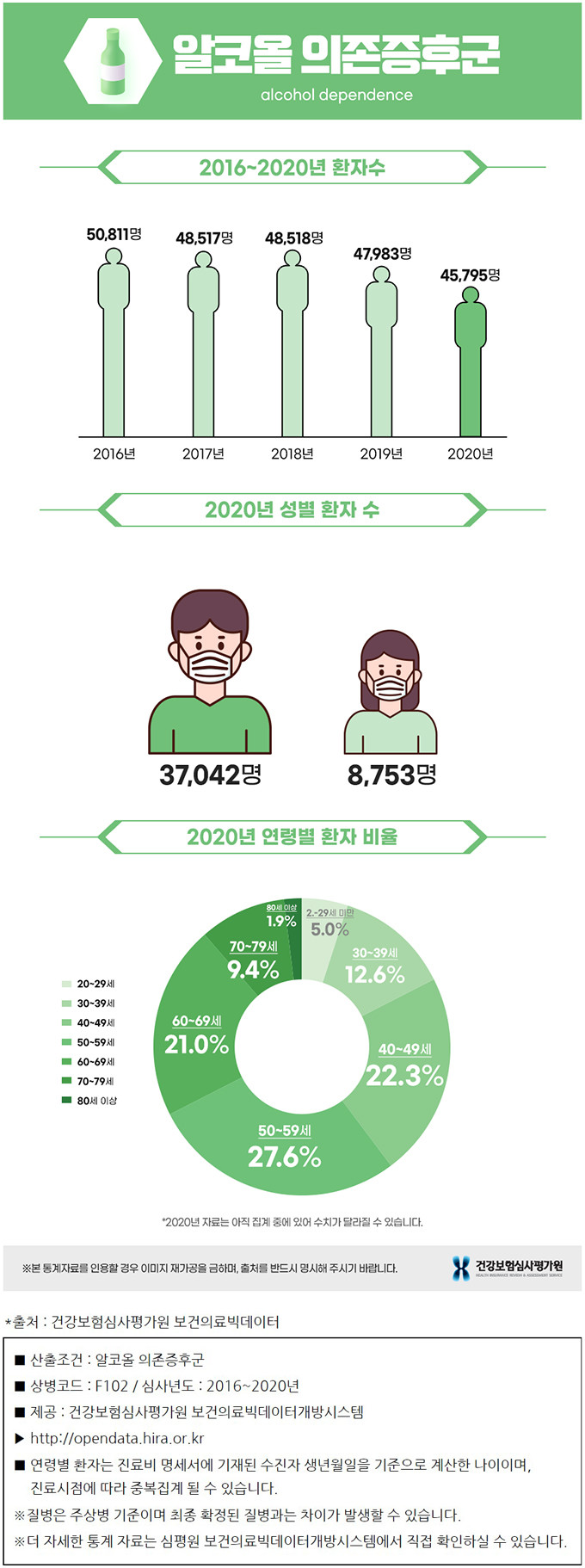 건강보험심사평가원의 통계에 따르면 2016년과 2020년을 비교했을 때 환자 수는 감소하고 있으나, 감소 추세는 뚜렷하지 않은 것으로 나타났습니다. 알코올 의존증후군은 남성 환자가 여성 환자보다 훨씬 큰 비율을 차지하고 있고, 특히 2020년에는 남성 환자 수가 여성 환자 수의 4.2배 이상 높았습니다. 나이대별 환자 수를 보면 50대 환자의 비율이 27.6%로 가장 높았으며, 40대와 60대가 그 뒤를 이었습니다.