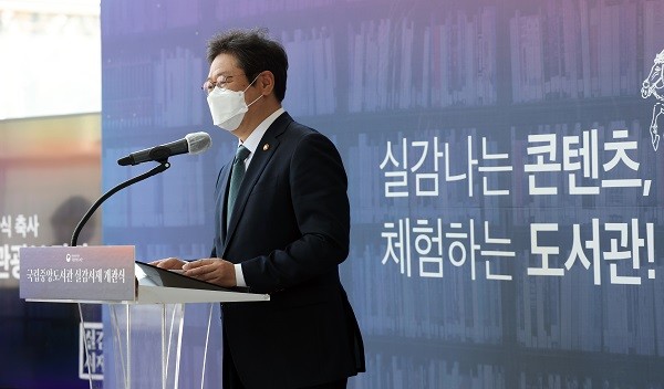 | ▲황희 문화체육관광부 장관이 22일 서울 서초구 국립중앙도서관 디지털도서관에서 열린 실감서재(뉴미디어 체험관) 개관식에서 축사를 하고 있다. |