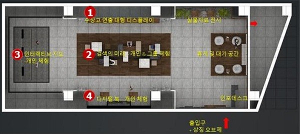 또한 실제 콘텐츠와 미래 기술 체험 연출을 혼합해 도서관의 미래 정보 검색을 연출하고, 도서관이 보유한 고지도를 고해상도 콘텐츠로 구현하고 멀티미디어 연출로 전달한다.