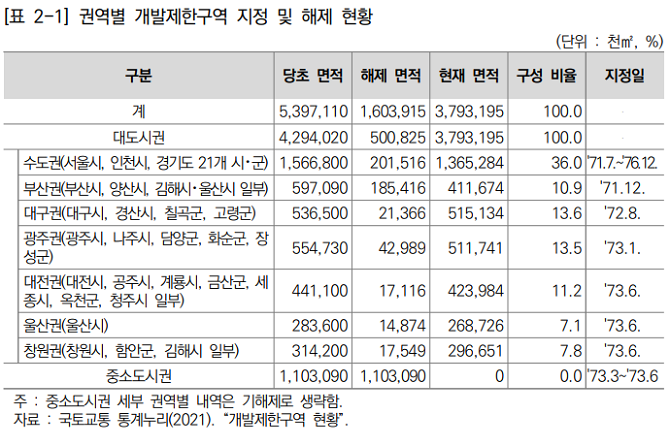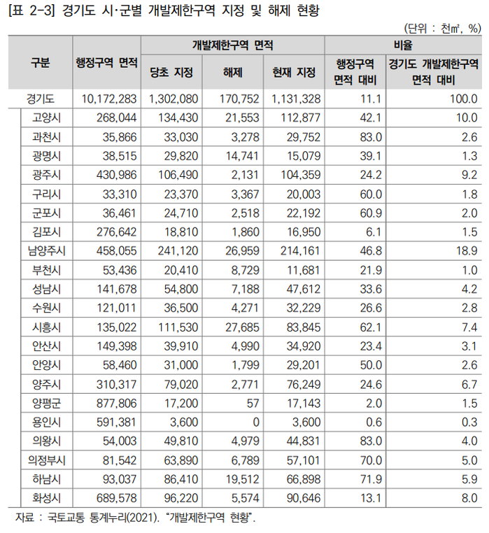 보고서에 따르면 도시의 무질서한 확산 방지와 자연 환경 보전이라는 목적 아래 지난 1971년 우리 정부는 ‘도시계획법’에 개발제한구역 지정을 규정했으며, 순차적으로 해제돼 현재 3793㎢가 지정돼 있다. 지난 2001년부터는 토지주와 주민이 받는 제약을 제도로 보전하기 위해 각종 지원사업이 시행돼 현재 경기도(전체 면적 1만 196㎢) 내 개발제한구역 면적은 1131㎢로, 전국의 30%를 차지하는 것으로 조사됐다.