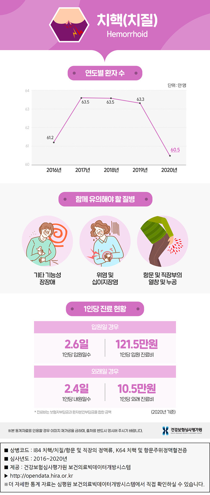 ① ‘치핵’ : 항문 안쪽 점막 및 점막하 조직이 다양한 원인에 의해 부풀어 오르거나 항문 밖으로 빠져나오는 병
