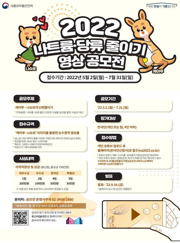 이번 영상 공모전은 누구나 참가할 수 있고 나트륨.당류 줄이기 캐릭터인 ‘케어루’와 ‘나슈로’를 활용해 2D, 3D 기반의 다양한 기법으로 제작한 60초 분량의 애니메이션 작품을 대상으로 하며, 개인 유튜브에 게시 후 공모전 누리집(www.na2022.co.kr)에서 신청할 수 있다.