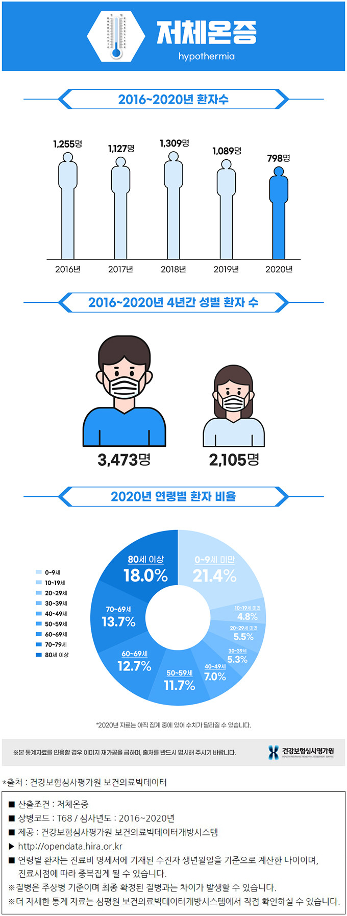 건강보험심사평가원의 통계에 따르면 코로나19로 외출이 줄어든 2020년을 제외하고 매년 저체온증 환자의 수는 천 명 이상을 기록했는데요. 특히 환자 중 남성의 비율이 굉장히 높았으며, 연령대별로는 9세 미만의 어린이와 80세 이상의 어르신 환자의 비율이 높았습니다.