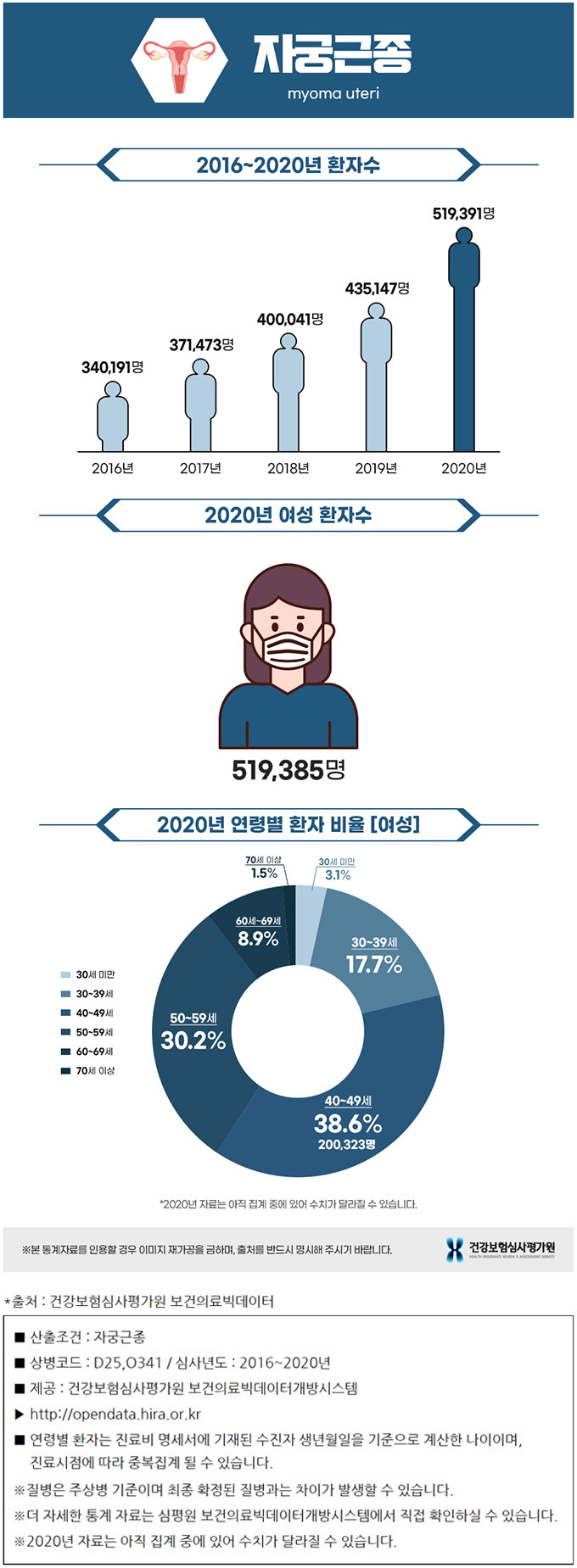 건강보험심사평가원의 통계에 따르면 자궁근종으로 병원을 찾는 여성은 매년 증가하고 있는 것으로 나타났는데요. 특히 2020년에는 환자수가 2016년에 비해 무려 52%나 증가했습니다. 연령별로 살펴보았을 때는 30살부터 환자수가 급증하기 시작하며 환자 중 40대 환자가 가장 많은 것으로 나타났습니다.