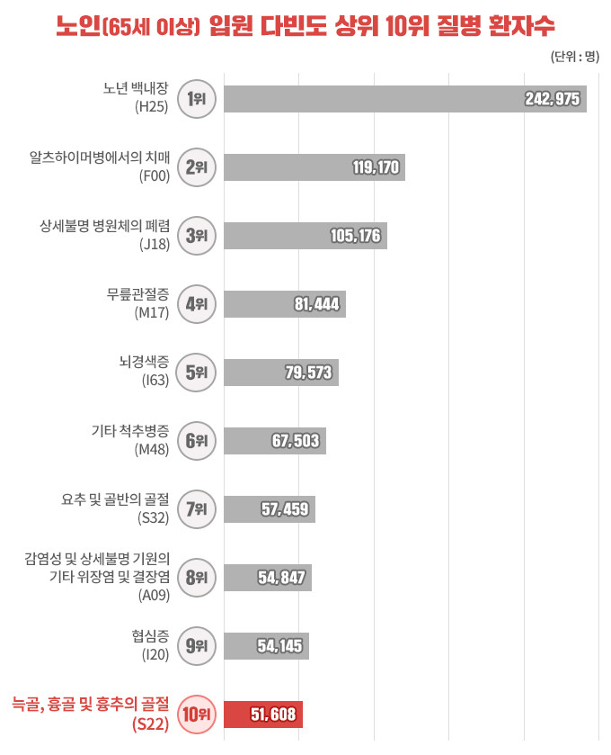 2019년 한 해 동안 입원한 65세 이상 노인이 많았던 질병을 소개해드리고 있습니다. 열 번째 질병은 가슴 부위를 보호하는 늑골, 흉골 및 흉추의 골절입니다.