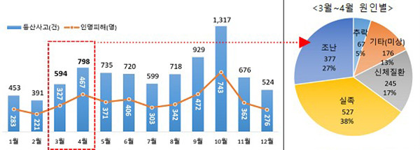지난 2020년 재난연감에 따르면 3월과 4월의 등산사고는 발을 헛디디거나 미끄러지는 실족이 38%로 가장 많았고, 길을 잃고 헤매는 조난은 27%였으며 지병 등으로 인한 신체질환은 17%였다.