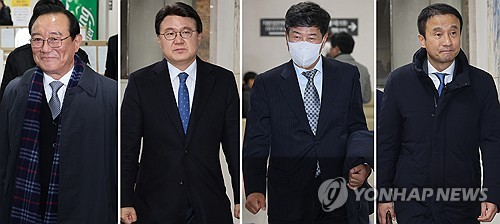 | ▲'울산시장 선거개입' 사건과 관련해 재판에 넘겨진 송철호 전 울산시장(왼쪽부터)과 더불어민주당 황운하 의원, 백원우 전 청와대 민정비서관, 더불어민주당 한병도 의원이 29일 오후 서울 서초구 서울중앙지법에서 열린 선고공판에 출석하고 있다. |