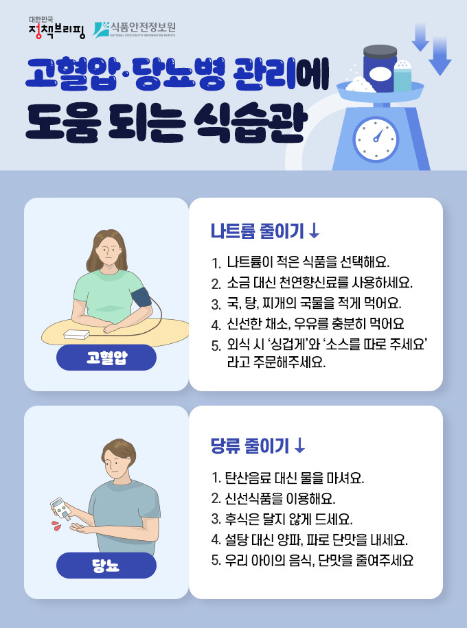 급격한 고령화로 인하여 고혈압, 당뇨병 환자가 증가하고 있으나 우리나라 국민의 고혈압 및 당뇨병 건강관리 수준은 그리 높지 않은 상황이다. 이와 관련하여 고혈압 및 당뇨병 관리에 도움이 되는 식습관을 소개한다.