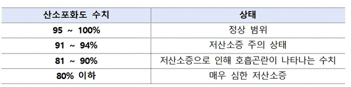 호흡기 질환 등이 없는 경우 산소포화도 수치가 95% 이상이면 정상으로 판단하며 평소 수치와 다를 때는 의사와 상담해야 한다.