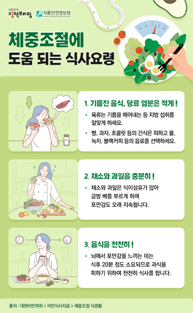비만 예방을 위해서는 무조건 적게 먹기보다는 곡류, 채소류, 고기·생선·달걀·콩류, 우유·유제품류, 과일류를 골고루, 알맞게, 제때에 먹는 것이 중요하다.