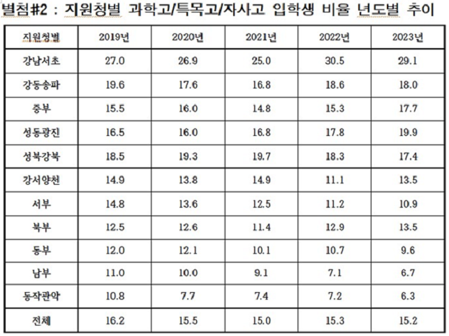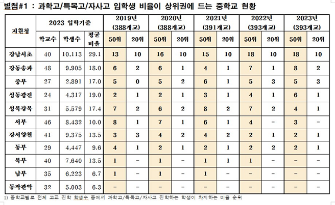 해당 자료에 따르면 2023년 입학기준으로 볼 때 과학고·특목고·자사고 입학비율이 상위 20위 안에 드는 중학교의 절반이 강남서초지역에 분포한 것으로 나타났고, 상위 50위 안에 드는 중학교는 강남서초 18개, 강동송파 8개, 중부 5개, 성동광진 6개, 성북강북 4개, 서부,동부,강서양천 각 3개 순으로 나타났다. 반면에 북부, 남부, 동작관악 지역의 경우 한 학교도 50위 안에 들지 못했다.