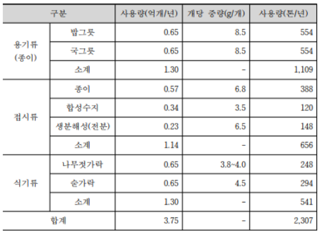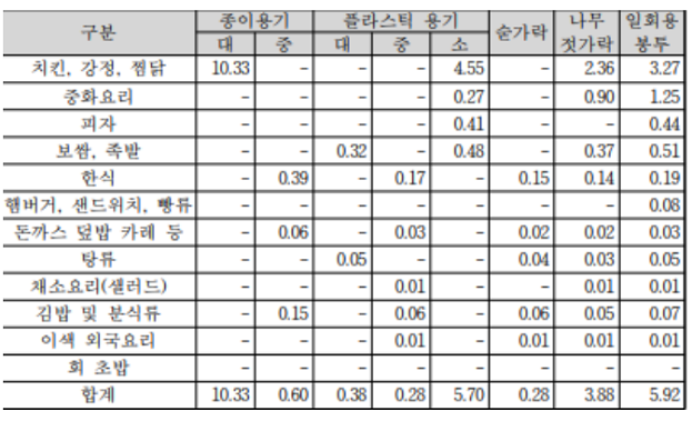 환경부가 실시한 연구용역(폐기물 직매립 제로화를 위한 1회용품 사용억제 로드맵 마련, 2019.11.) 결과에서도 국내 연간 배달용 1회용품 사용량은 용기류 1만 7천 3백톤, 식기류 약 4천톤, 봉투 약 6천톤에 이른다.