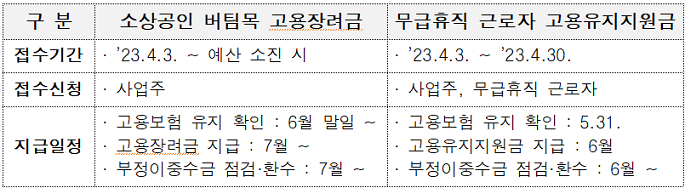한편, ‘중소벤처기업부 소상공인 정책자금 융자제외 업종’ 및 비영리단체(중소기업 및 소상공인 범위 미포함)는 지원대상에서 제외되며. 지원금 산정기간 동안 공공기관 유사 일자리 정책 사업(고용장려금, 고용유지지원금)의 지원금을 신청·수령한 경우도 지원 대상에서 제외된다.