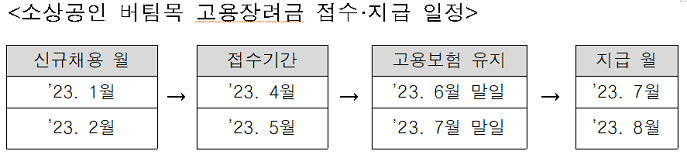 신규인력 채용 후 3개월 이상 고용을 유지하고 있는 기업에서 신청 할 수 있으며 신청 후 3개월간 고용보험을 유지한 경우에 고용장려금을 지급한다. 즉 ’23년 1월에 신규인력을 채용한 경우 4월에 지원금 신청, 6.30.까지 고용보험 유지 여부를 확인, 7월에 고용장려금을 지급(총 6개월 고용유지)한다.