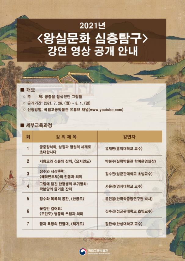 문화재청 국립고궁박물관(관장 김동영)은 온라인 교육 프로그램인 ‘왕실문화 심층탐구’의 강연 영상 7편을 7월 26일부터 8월 1일까지 일주일 동안 국립고궁박물관 유튜브https://www.youtube.com/gogungmuseum)에서 공개한다. ‘왕실문화 심층탐구’는 일반인들이 왕실문화에 대해 깊이 이해할 수 있도록 개설한 교육 프로그램으로, 올해는 6월부터 7월까지 ‘궁중장식화’를 주제로 총 7회의 강좌가 운영된 바 있다.