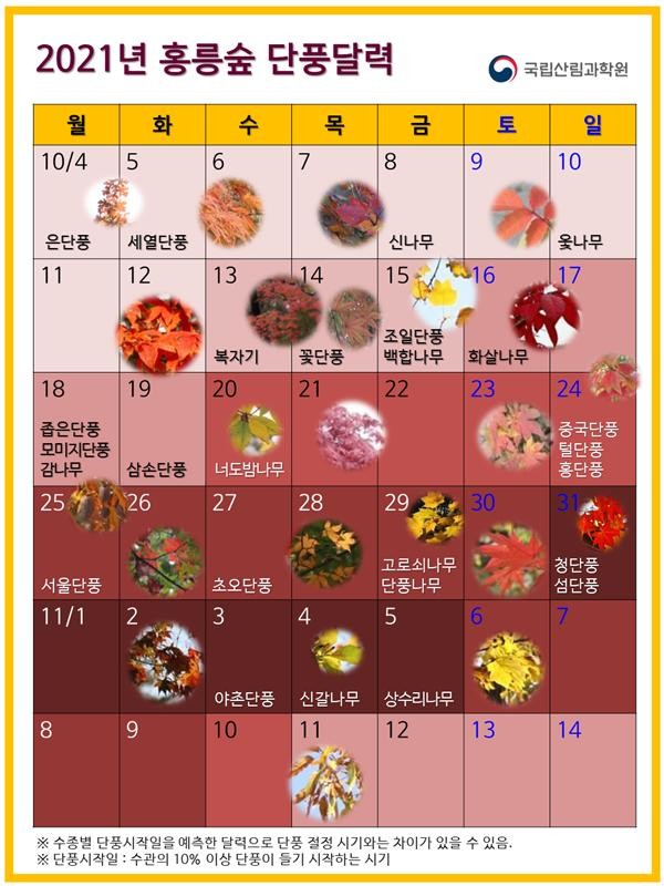 산림청 국립산림과학원(원장 박현)은 서울 홍릉숲 내 나무들의 단풍 시작 예상일을 담은 ?2021년 홍릉숲 단풍달력?을 발표했다.