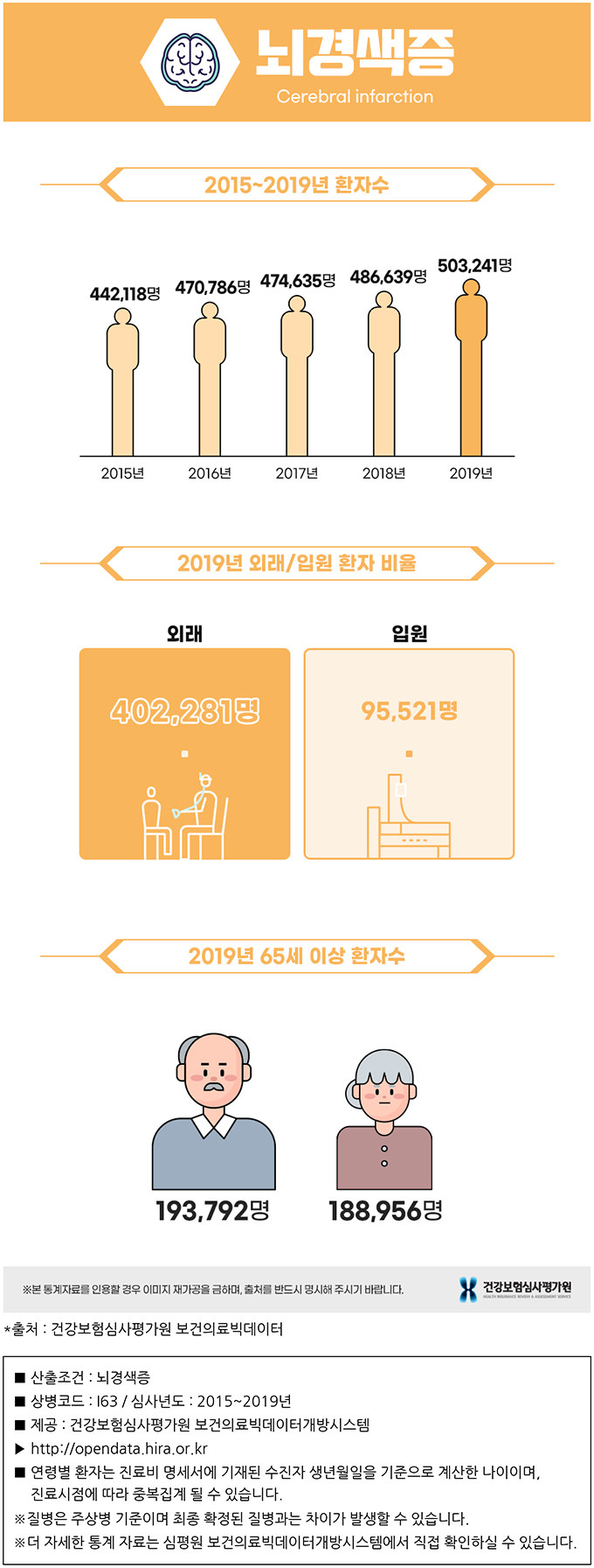 건강보험심사평가원의 통계에 따르면 뇌경색증으로 병원을 찾는 환자는 2015년부터 매년 증가하고 있으며, 2017년부터 전년대비 증가폭도 늘어나고 있는 추세입니다. 뇌경색증은 특히 입원 비율이 19%로 대략 5명 중 1명이 입원하는 것으로 나타났습니다. 또한 전체 환자 중 65세 이상 환자는 69.9%로 나타났으며 성별 간 큰 차이는 없었습니다.