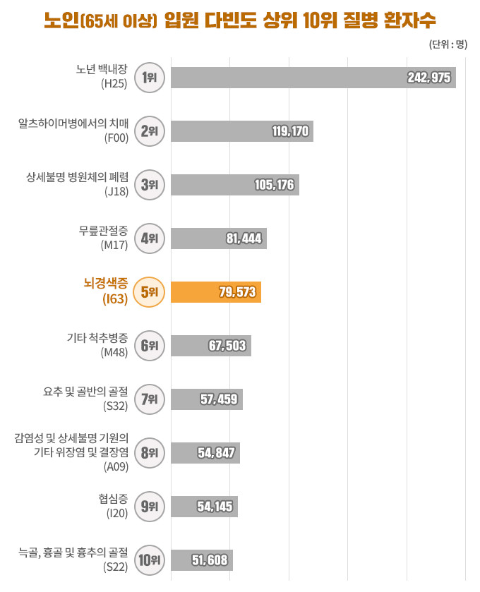 2019년 한 해 동안 입원한 65세 이상 노인이 많았던 질병을 소개해드리고 있습니다. 다섯 번째 질병은 뇌혈관이 막혀 뇌에 혈액순환이 되지 않아 발생하는 ‘뇌경색증’입니다.
