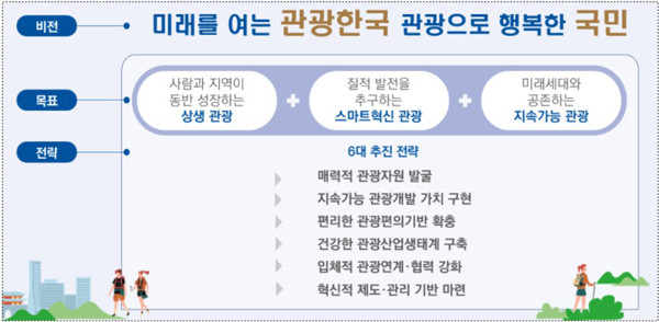 또 이를 위해 ▲매력적인 관광자원 발굴 ▲지속가능 관광개발 가치 구현 ▲편리한 관광편의 기반 확충 ▲건강한 관광산업생태계 구축 ▲입체적 관광 연계·협력 강화 ▲현신적 제도·관리 기반 마련 등 6대 전략과 17개 중점과제를 추진한다.