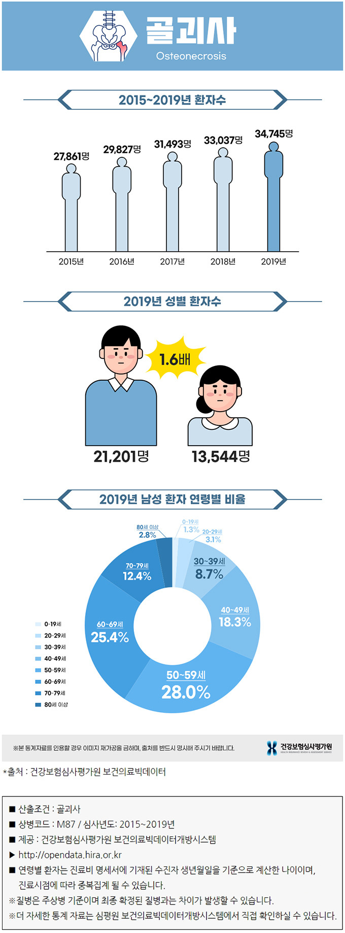 건강보험심사평가원의 통계에 따르면 골괴사 환자는 매년 꾸준히 증가하고 있습니다. 2015년 2만 7861명이었던 수진자는 2019년 3만 4745명으로 4년간 약 25% 증가했습니다. 남성 수진자(2만 1201명)가 여성 수진자(1만 3544명)에 비해 약 1.6배 많았는데요. 그중 50대 환자(28.0%)가 가장 많았고, 60대(25.4%), 40대(18.3%) 환자가 그 뒤를 이었습니다.