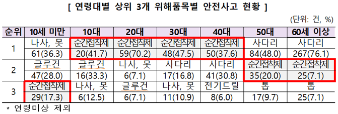 ‘순간접착제’는 연령대별 안전사고 상위 3개 품목에 모두 포함돼 가정내 작업공구 관련 안전사고 비율이 높은 것으로 나타났으며, 전체 가정내 작업공구 관련 안전사고의 25.1%(269건, 연령미상 포함)를 차지했다.
