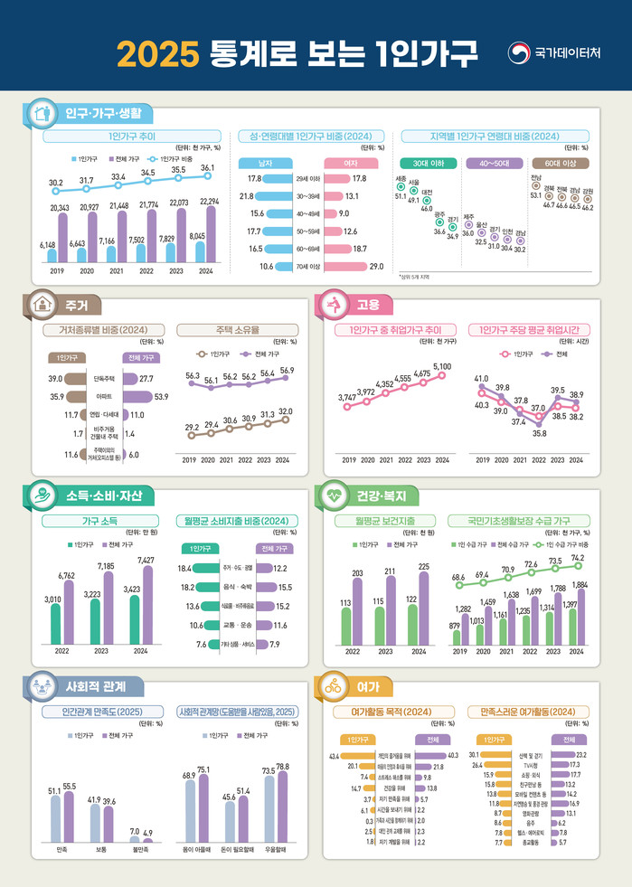 지난해 한국의 1인 가구 수가 처음으로 800만을 넘어섰으며, 이들 중 절반 이상이 외로움을 느끼고 있는 것으로 나타났다. 국가데이터처가 9일 발표한 '2025 통계로 보는 1인 가구'에 따르면, 1인 가구는 804만 5000가구로 전체 가구의 36.1%를 차지하며 역대 최고치를 기록했다.