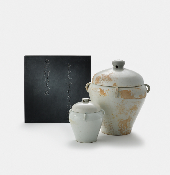 소개하는 <숙종 태항아리>는 태를 담는 작은 내(內)항아리와 내항아리를 담는 큰 외(外)항아리로 구성되었다. 항아리의 어깨 부분에 구멍을 낸 고리를 달았고, 뚜껑에는 구멍을 뚫은 손잡이를 만들었으며, 몸체와 뚜껑에 끈을 교차시켜 항아리를 봉할 수 있게 하였다. 태항아리는 숙종의 생년월일을 적은 태지석도 함께 묻었다.