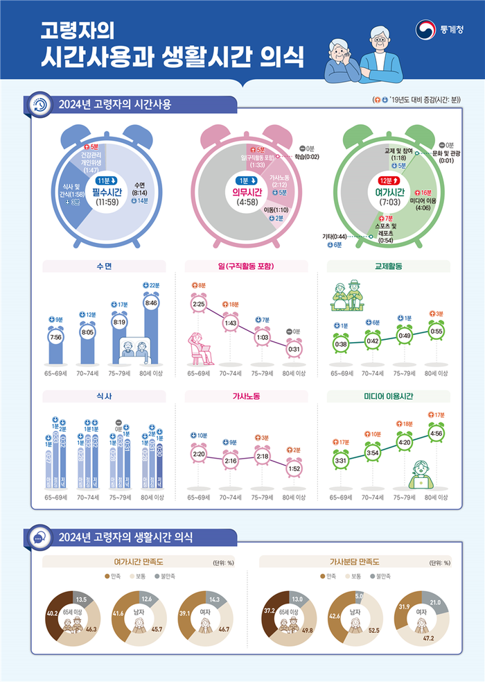 고령자 중 58.0%는 외모 관리를, 34.5%는 셀프 건강관리를 하고 있으며, ICT 기기 사용 시간과 영상 시청 시간이 크게 늘었다. 평균 수면시간은 8시간 14분으로 줄어들었다. 이러한 변화는 고령자들이 더 나은 삶의 질을 추구하고 있음을 보여준다.