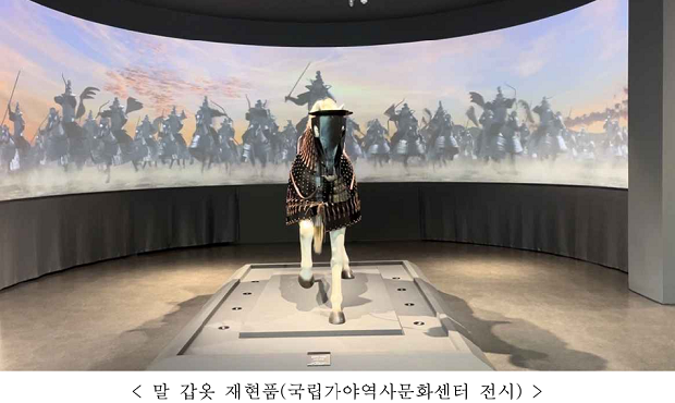 국립가야문화유산연구소는 1994년 발굴된 함안 말이산 8호분에서 출토된 말 갑옷 재현품을 대상으로 실험을 실시했다. 2020년부터 진행된 과학적 분석에서 갑옷 부위별 탄소 함량 차이가 확인됐다. 말의 몸통을 보호하는 신갑은 탄소 함량이 낮았고, 목과 가슴을 보호하는 경·흉갑은 높은 탄소 함량을 보였다.