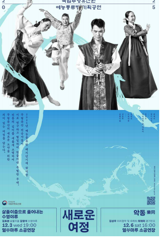 전통과 현대의 조화를 통해 무형유산의 새로운 가능성을 탐구하는 무대가 전주에서 열린다. 국립무형유산원은 12월 3일과 6일 전북 전주 국립무형유산원 얼쑤마루 소공연장에서 '예능풍류방' 하반기 기획공연 '새로운 여정'을 개최한다고 밝혔다.