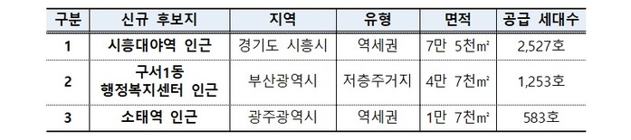 국토교통부는 22일 경기 시흥시 시흥대야역 인근, 부산 금정구 구서1동 행정복지센터 인근, 광주 동구 소태역 인근 3곳을 도심 공공주택 복합사업의 10차 후보지로 선정했다고 밝혔다.