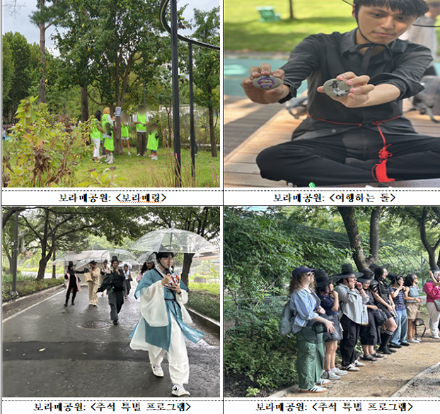 남산공원, 낙산공원, 용산가족공원에서는 특히 추석 분위기를 더하는 전통놀이 프로그램이 마련됐다. 남산공원에서는 '솟대' 만들기와 함께 꿀벌 탐사 프로그램이 운영되며, 낙산공원에서는 제기차기와 비석치기, 한양도성 순성놀이가 즐거움을 더한다. 윷놀이, 투호 놀이가 기다리는 용산가족공원은 전통놀이의 재미를 느끼기에 충분하다.