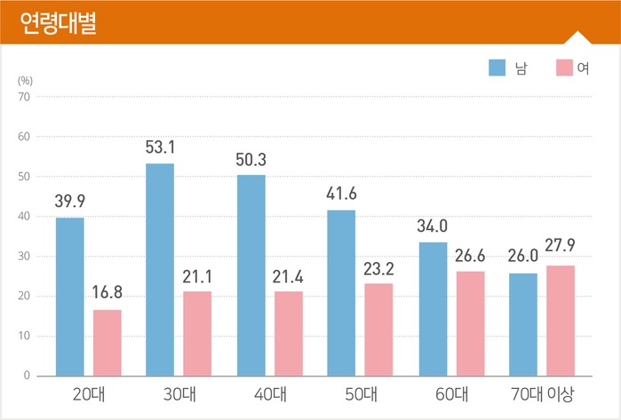 조사 결과, 남성의 비만율은 41.4%로 여성의 23.0%보다 약 1.8배 높았다. 특히 30대와 40대 남성의 비만율이 각각 53.1%와 50.3%로 높았다. 여성은 60대와 70대에서 비만율이 상대적으로 높았다.
