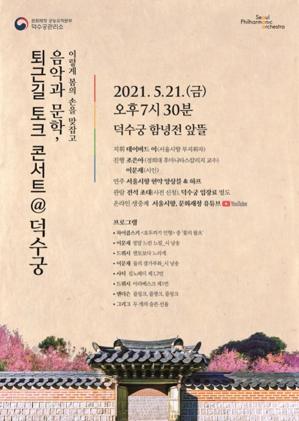 문화재청 궁능유적본부 덕수궁관리소(소장 원성규)는 (재)서울시립교향악단(대표이사 직무대행 유연식)과 함께 오는 21일, 저녁 7시 30분부터 함녕전 앞에서 ‘퇴근길 토크 콘서트’를 개최한다.
