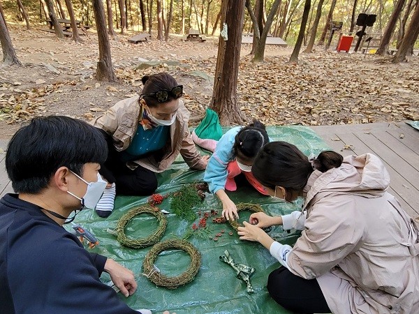 | ▲편백 나뭇잎과 솔방울 등 자연물을 활용한 솔방울 리스 만들기 체험 모습. (사진=한국관광공사 부산울산지사) |