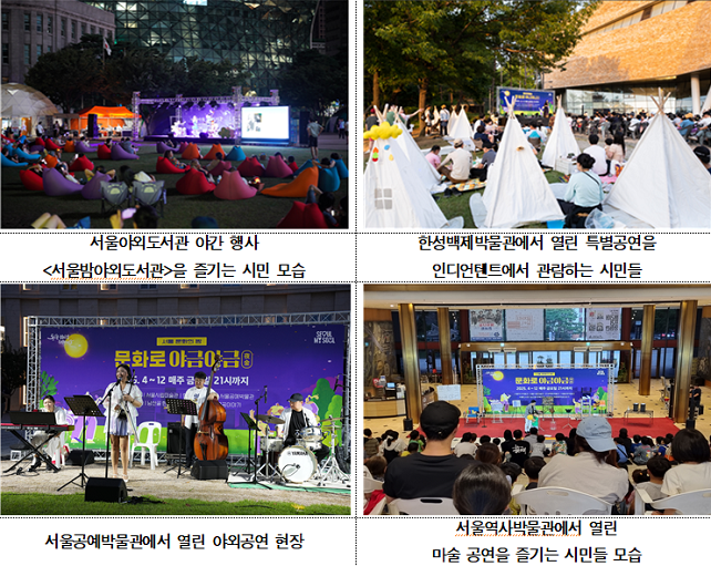 김태희 서울시 문화본부장은 "11월 '문화로 야금야금'은 늦가을 밤의 정취 속에서 시민들이 따뜻한 문화적 감성을 채울 수 있도록 다채롭게 준비했다"며 "앞으로도 계절에 맞는 특색 있는 야간 프로그램을 통해 문화가 시민들의 고단한 일상에 따뜻한 위로와 새로운 활기가 될 수 있도록 노력하겠다"고 말했다.