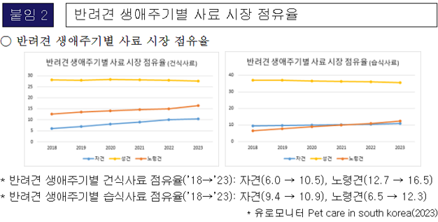 최근 반려견 맞춤형 사료에 대한 관심이 증가하면서 어린 반려견용 건식 사료 시장은 2018년 6.0%에서 2023년 10.5%로, 노령견용 사료는 같은 기간 12.7%에서 16.5%로 성장했다.
