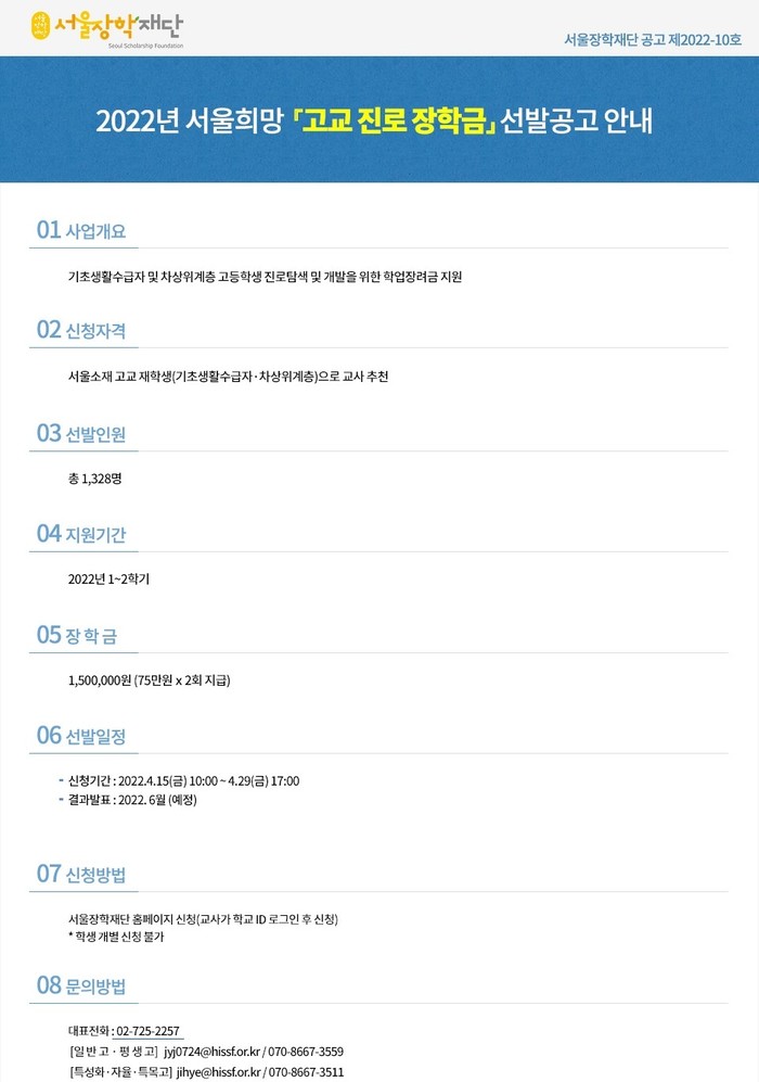 한편 2022년 서울 희망 고교진로 장학금, 오토꿈이룸서울 장학금에 대한 자세한 문의는 서울장학재단 홈페이지(www.hissf.or.kr) 또는 전화(02-725-2257)로 하면 된다.
