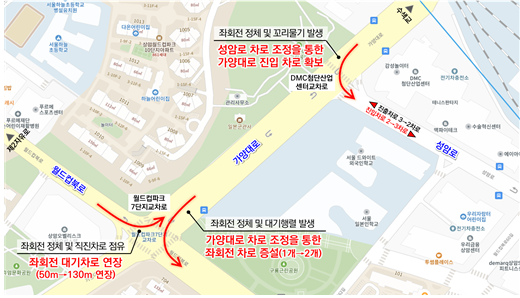 가양대로(월드컵파크7단지 교차로~DMC첨단산업센터 교차로)에는 좌회전 차로가 1개에서 2개로 늘어나고, 올림픽선수기자촌아파트 교차로와 중앙대병원입구 교차로의 좌회전 대기차로가 연장된다. 이는 교차로 꼬리물기와 정체를 해소하기 위한 조치다.