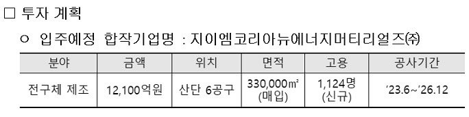 지이엠코리아뉴에너지머티리얼즈㈜는 새만금의 우수한 지원정책과 보조금 혜택, 광활한 용지 등 지속적인 사업확장이 유리한 점에 높은 점수를 준 것으로 전해졌다.