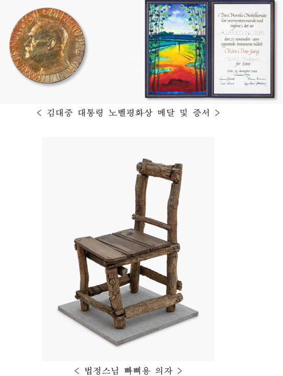 김대중 대통령의 노벨평화상 메달과 증서는 2000년 한국인 최초로 수상한 것으로, 한국과 동아시아의 민주주의와 인권 신장에 기여한 업적을 기린다. 법정 스님의 ‘빠삐용 의자’는 스님이 직접 제작한 수행용 의자로, 그의 삶과 철학을 상징한다.